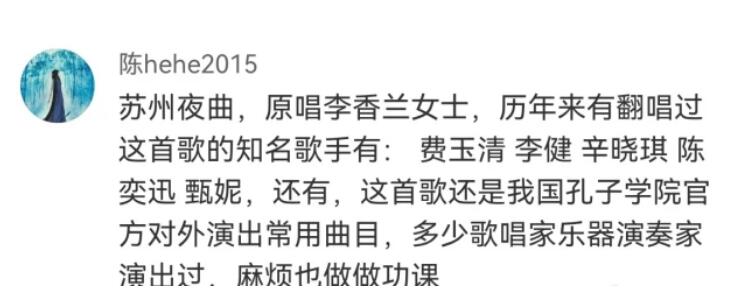 霍尊的支持者甚至还搬出了其他翻唱《苏州夜曲》的歌手名单,其中比较惹眼的有费玉清、辛晓琪、李健等知名歌手,甚至还有孔子学院的学员,霍尊支持者想以此证明《苏州夜曲》是没有任何问题的。
