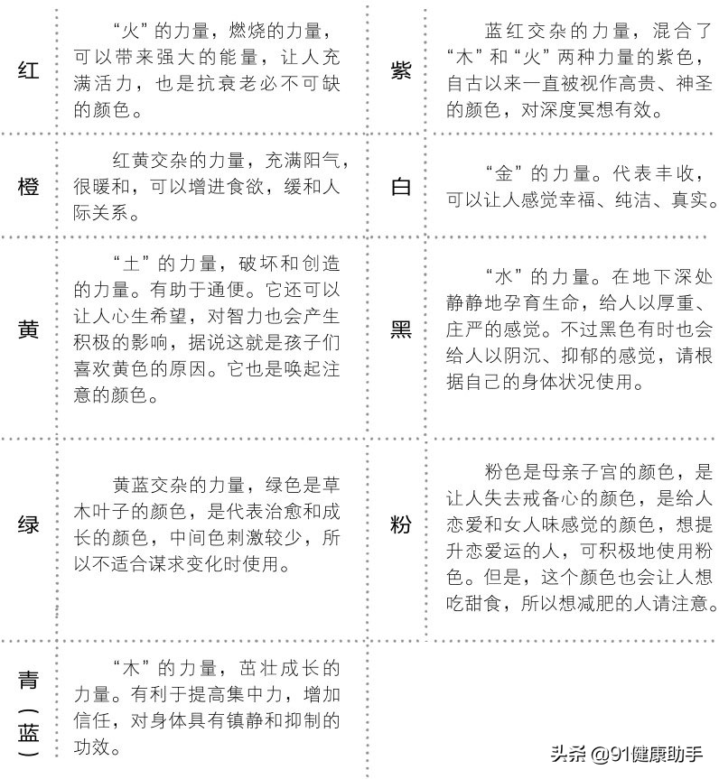 颜色会对身体产生巨大的影响,所以建议多看自己喜欢的画作或书。你也可以通过服饰、化妆等对周围产生你所希望的影响。表格总结了各种颜色所蕴含的力量,请参考。