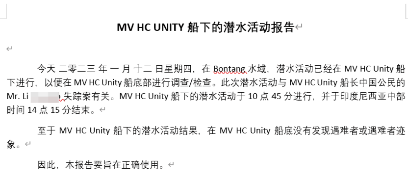 去年12月31日和今年1月,李某甲在家属对接群里先后转发了两份由海昌公司在印尼的船舶代理出具的搜救报告。报告显示,海上、陆地两个行动小组的搜索迄今无果。