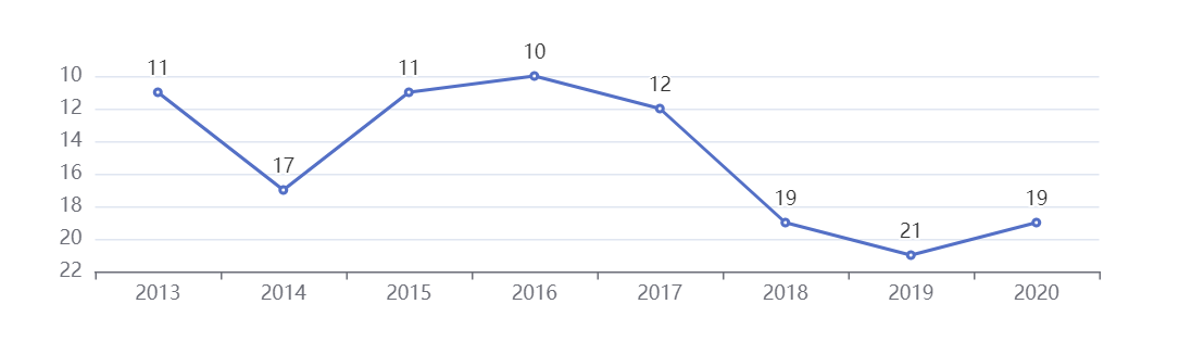 近些年的走势波动并不大,始终居于前20。